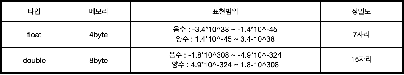 타입별로 차지하는 메모리 공간의 크기와 표현범위
