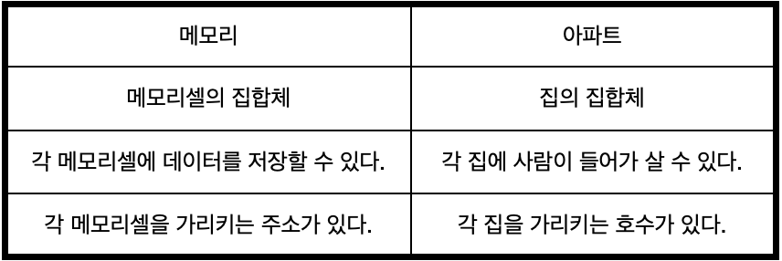 메모리는 1byte 크기의 데이터를 저장할 수 있는 메모리 셀들이 모여서 만들어지고 각 메모리셀에는 고유 번호가 오름차순으로 매겨져 있다. 이를 메모리 주소라고 한다.