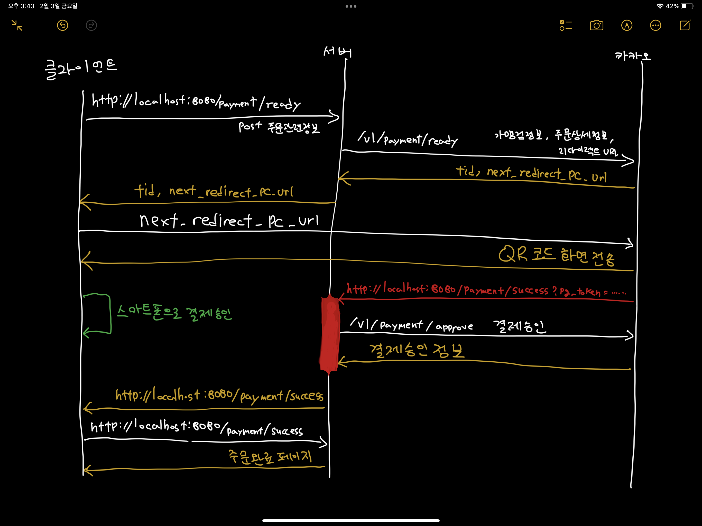 - 카카오는 승인과 동시에 다음 결제과정의 URL과 tid(카카오 결제코드)를 서버로 던져주고 서버는 클라이언트에 URL을 보내준다.