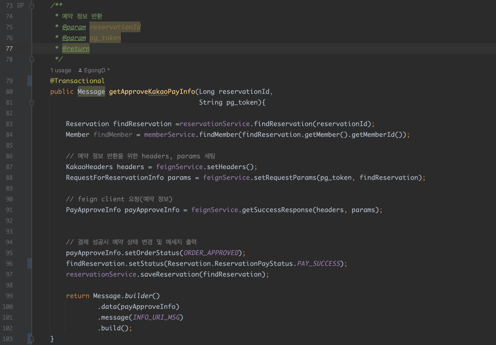 Feign Client를 요청해 예약 정보를 반환해서 결제가 성공하면 예약 상태를 변경해 주고 메세지를 출력해 준다.
