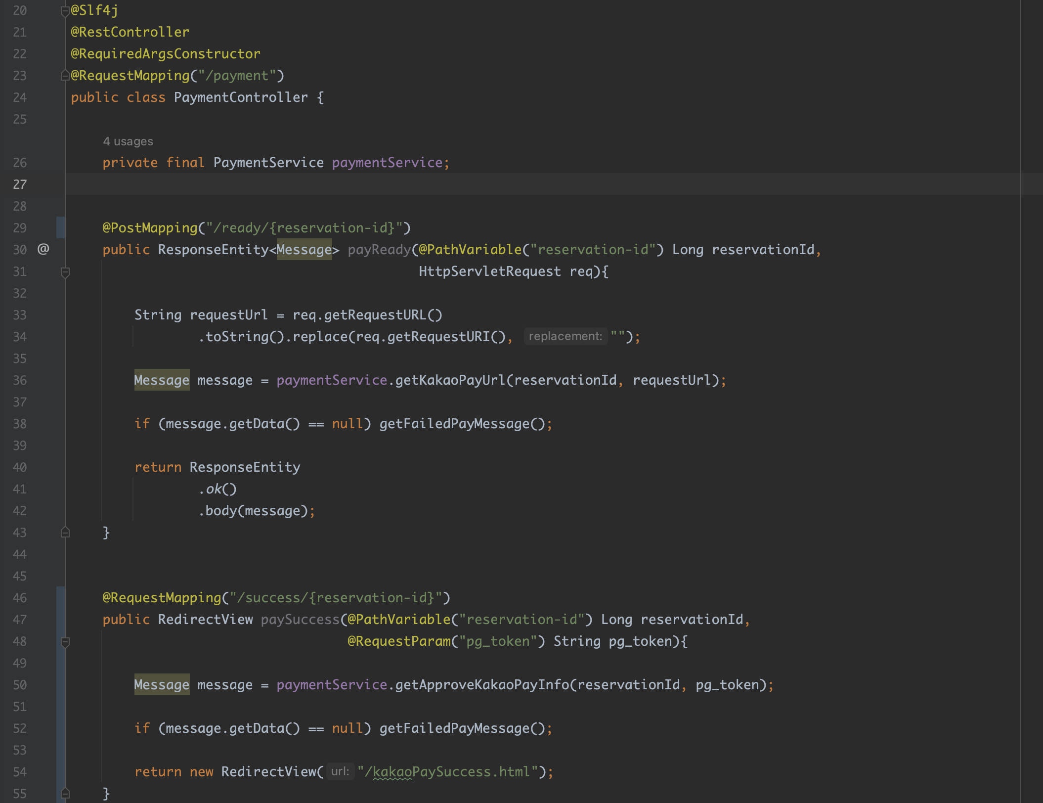 그리고 Feign Client요청을 해주고 결제 요청이 오면 해당 데이터를 예약 정보에 저장해 준다.