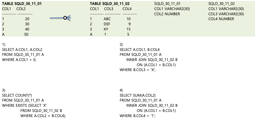 - A테이블 선택하고 A.COL2 > 10; 이니까 A전체 선택한다. A.COL1 = B.COL1에서 A가 2개 중복되서 오류가 난다.