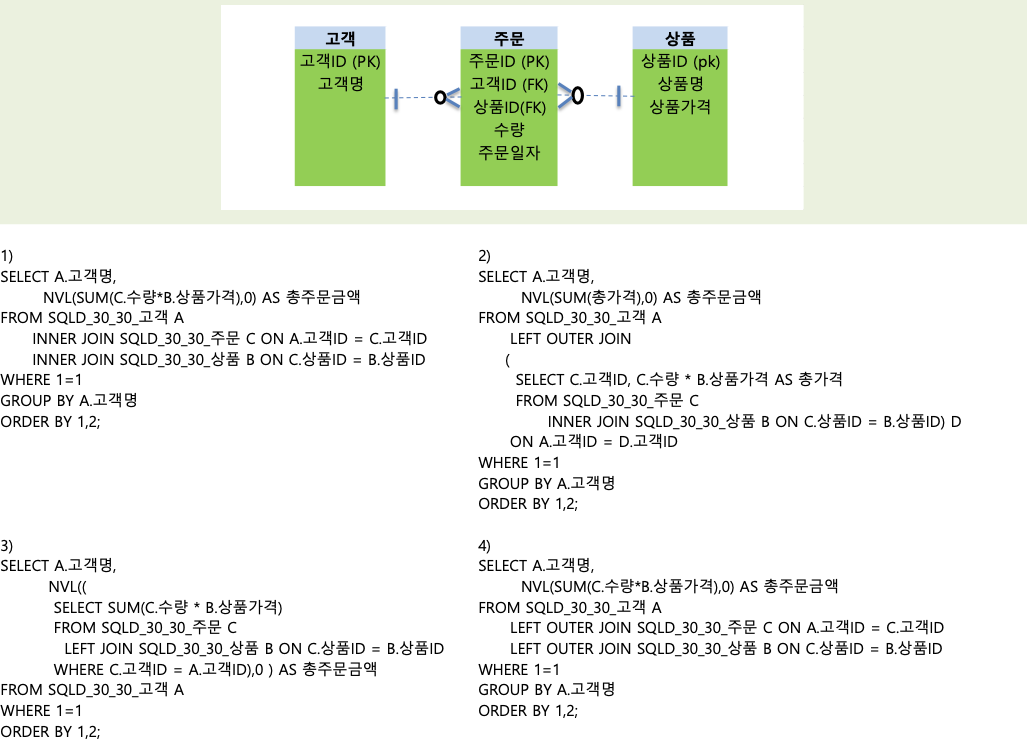 - INNER JOIN SQLD_30_30_주문 C ON A.고객ID = C.고객ID