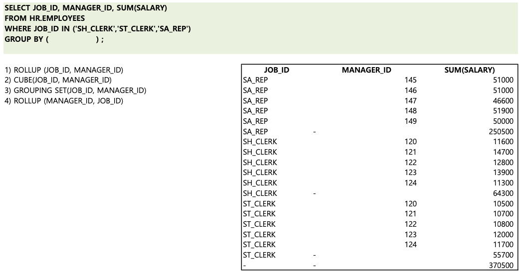 - JOB_ID에 대한 합과, 총 합을 구하기 때문에 ROLLUP(JOB_ID, MANAGER_ID)를 사용한다. 인수 순서를 바꾸면 값이 달라지니까 인수 순서를 바꾸면 안된다.
