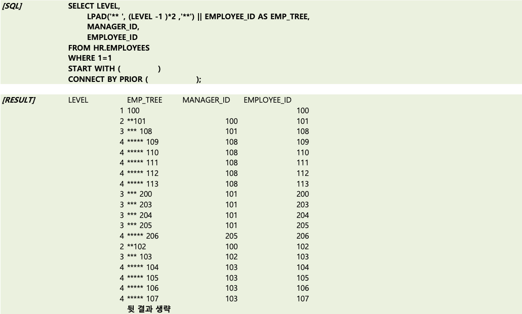 - HR.EMPLOYEES에서 출발해서 START WITH () 인데 첫번째에 MANAGER_ID가 비어있으므로 "MANAGER_ID IS NULL"이 들어가야 한다.