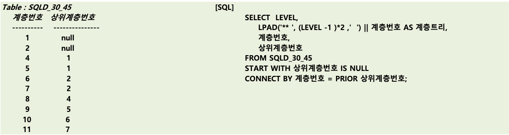 - CONNECT BY 계층번호 = PRIOR 상위계층번호