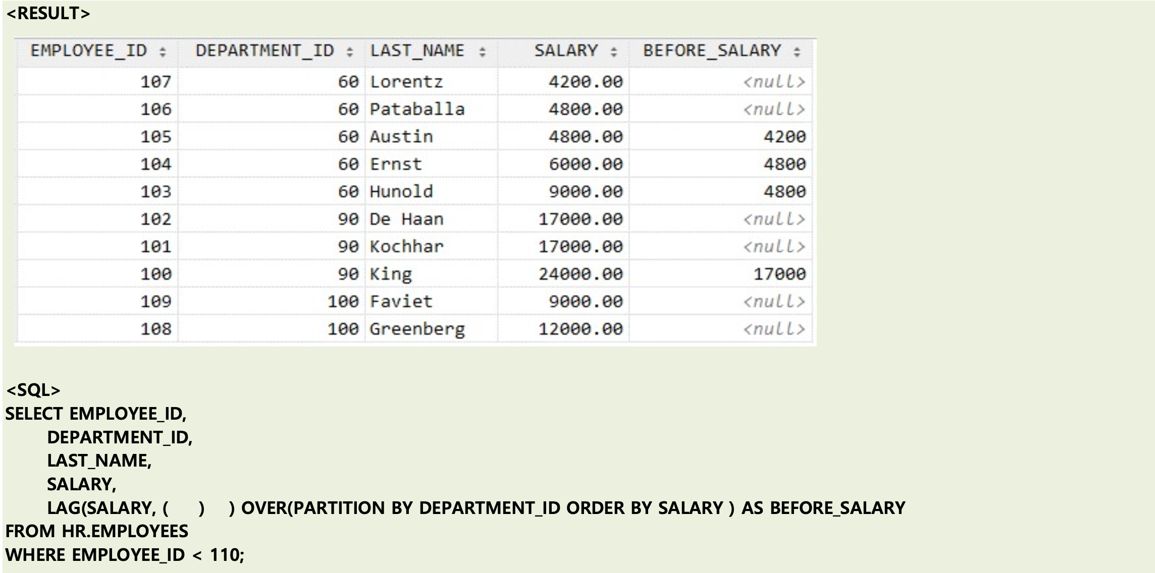 - LAG(SALARY, () ) OVER(PARTITION BY DEPARTMENT_ID ORDER BY SALARY) AS BEFORE_SALARY