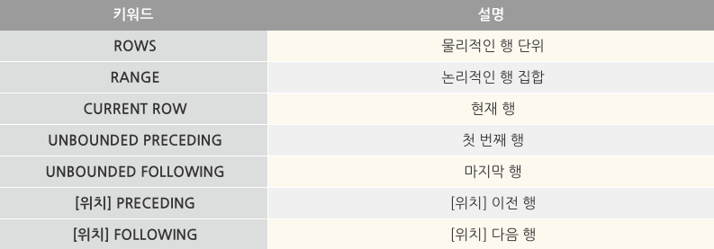 - BETWEEN UNBOUNDED PRECEDING | CURRENT ROW | 상수값 PRECEDING or FOLLOWING