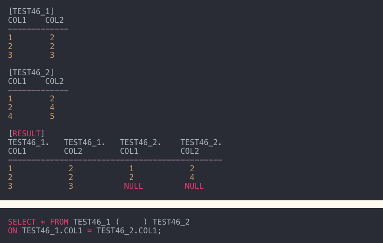 - 결과 테이블에서 TEST46_1의 3번 행만 (COL1, COL2)가 조회되고 TEST46_2는 3번 행이 NULL이므로 'LEFT OUTER JOIN'을 실행한 것이다.