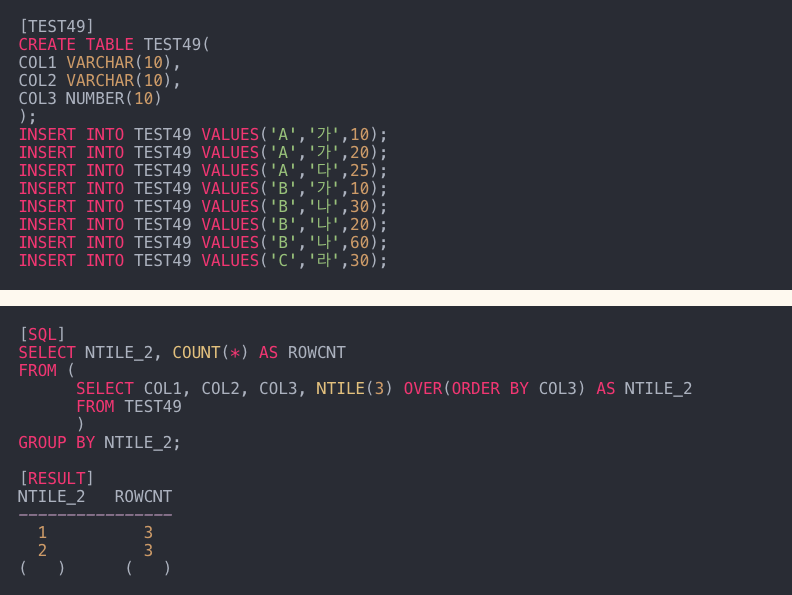 그리고 각 등분에 대해서 COUNT를 계산하므로 ROWCNT는 3, 3, 2가 된다. - 따라서 NTINE_2 -> 3이 들어가고 ROWCNT -> 2가 들어간다.