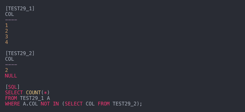 - NOT IN문 서브쿼리의 결과 중에 NULL이 포함되는 경우 데이터가 출력되지 않는다.