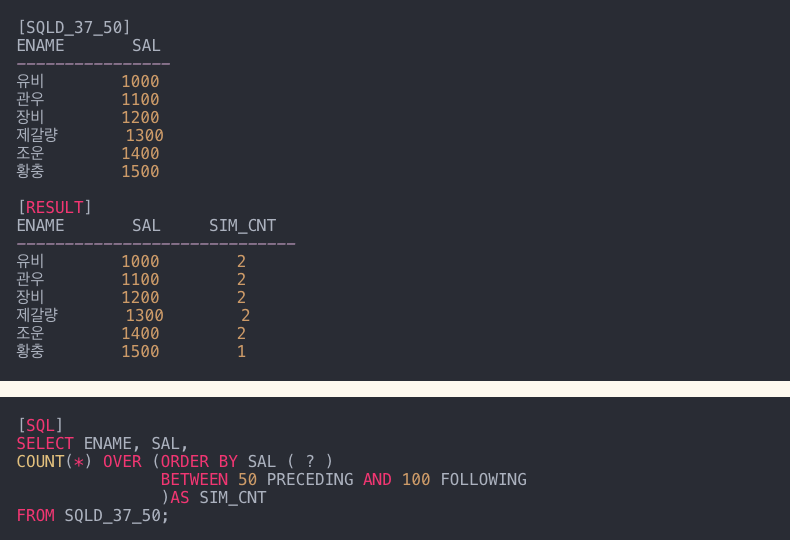 - SQLD_37_50 테이블에서 결과값과 같이 반환되도록 SAL속성을 기준으로 정렬을 수행하고, 각 행의 SAL 속성값을 기준으로 -50 ~ +150 범위 사이에 포함되는 SAL값을 가지는 모든 행의 수를 COUNT 하여 SIM_CNT속성값으로 조회한다.