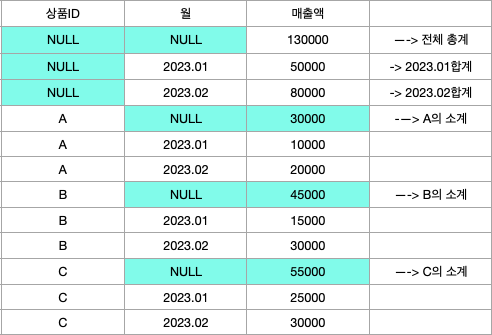 - 소 그룹 간의 합계를 계산하는 함수이다. ROLLUP을 사용하면 GROUP BY로 묶은 각각의 소그룹의 합계와 전체 합계를 모두 구할 수 있다.