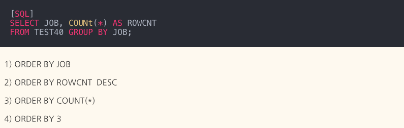 - 문제의 SQL문은 SELECT구에 JOB, ROWCNT 두 개의 컬럼이 있다.