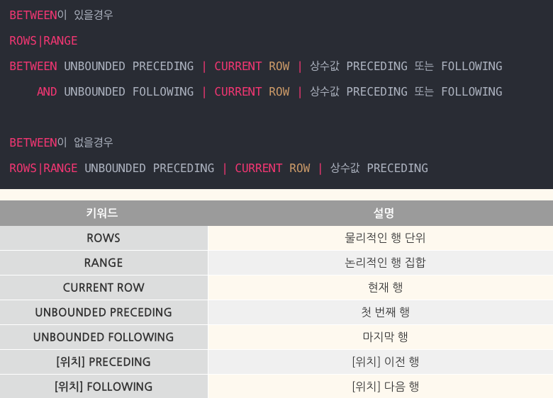 - 윈도우절은 ROWS or RANGE 둘 중 하나를 선택하고 BETWEEN도 선택적으로 사용해서 결과에 대한 범위를 지정할 수 있다.