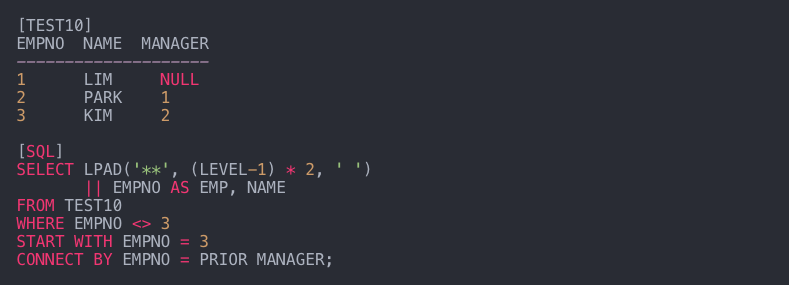 -> EMPNO가 3인 행부터 시작 - CONNECT BY EMPNO = PRIOR MANAGER 가 실행돼서