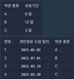 - 1 ≤ terms의 길이 ≤ 20 -> terms의 원소는 "약관 종류 유효기간" 형태의 약관 종류와 유효기간을 공백 하나로 구분한 문자열입니다. -> 약관 종류는 A~Z중 알파벳 대문자 하나이며, terms 배열에서 약관 종류는 중복되지 않습니다. -> 유효기간은 개인정보를 보관할 수 있는 달 수를 나타내는 정수이며, 1 이상 100 이하입니다.