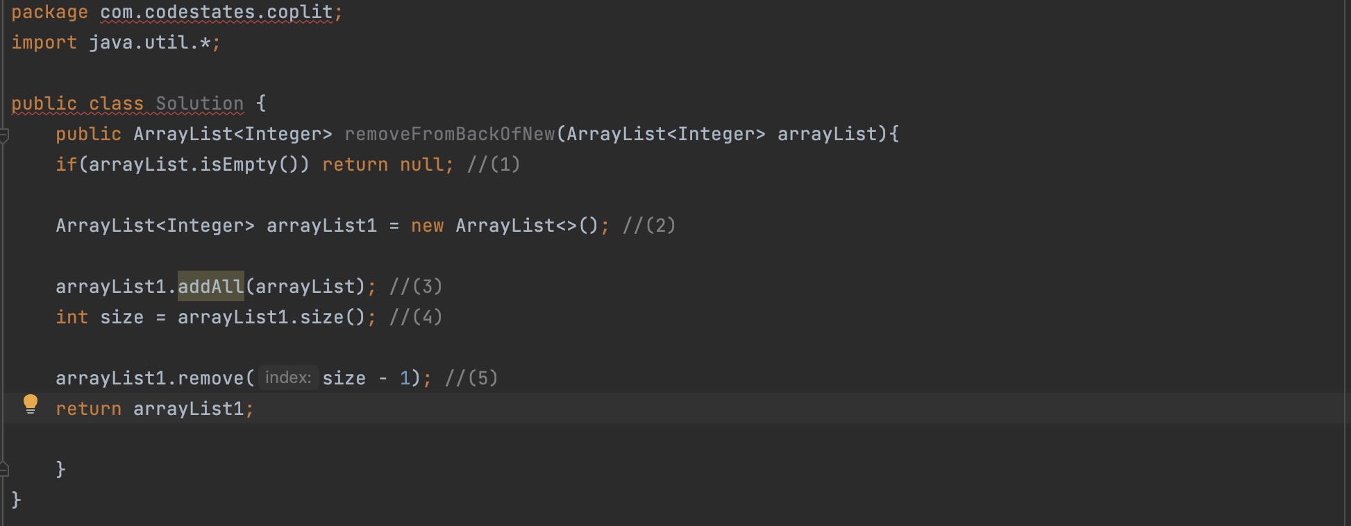 ArrayList와 요소를 입력받아, 마지막 요소가 제거된 새로운 ArrayList를 리턴해야 합니다.