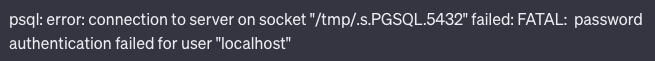 PostgreSQL 서버에 접속할 때 발생하는 오류로, "localhost" 사용자의 비밀번호 인증에 실패했다는 것을 의미합니다. 이 오류는 주로 제공된 비밀번호가 잘못되었거나 사용자에 대해 구성된 인증 방법이 서버에서 요구하는 방법과 일치하지 않을 때 발생합니다.