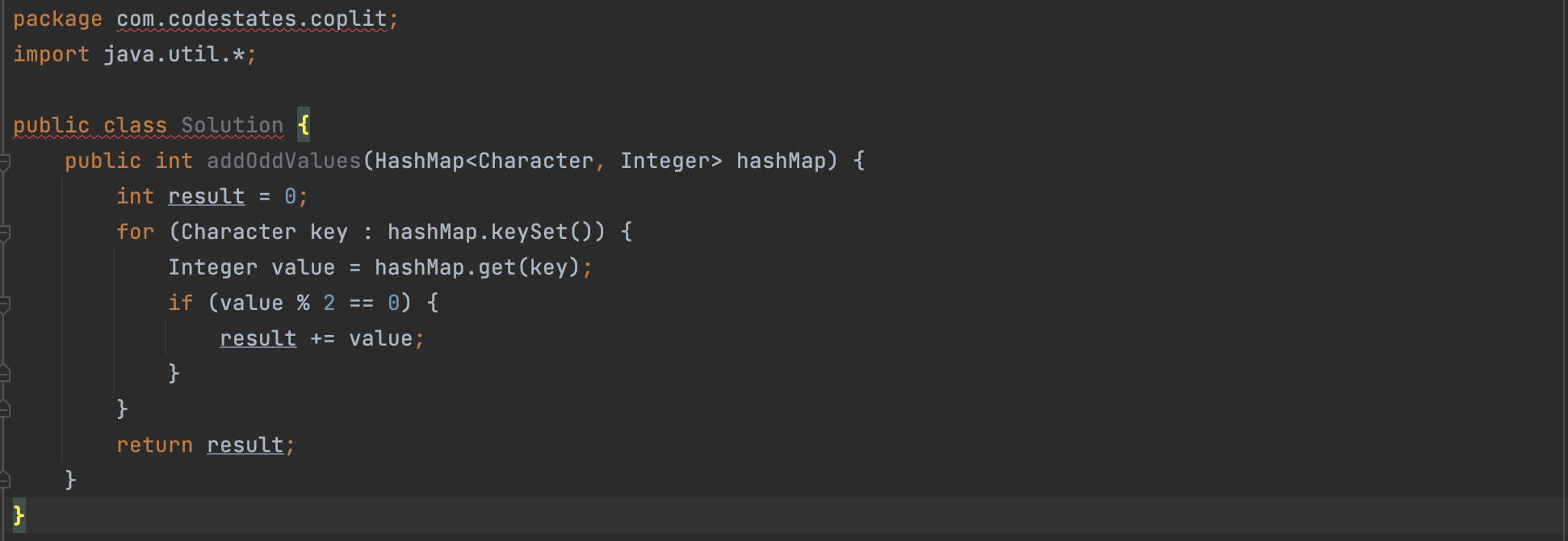 <Character, Integer>타입을 요소로 가지는 HashMap을 입력받아 짝수 값(Value) 끼리 모두 더한 값을 리턴해야 합니다.