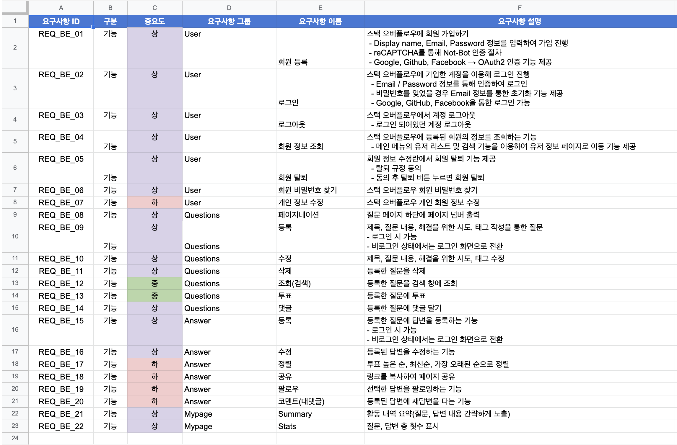 요구사항이 어떤 부분인지 그룹을 나누고 이름과 구현해야하는 내용을 설명에 적었다.