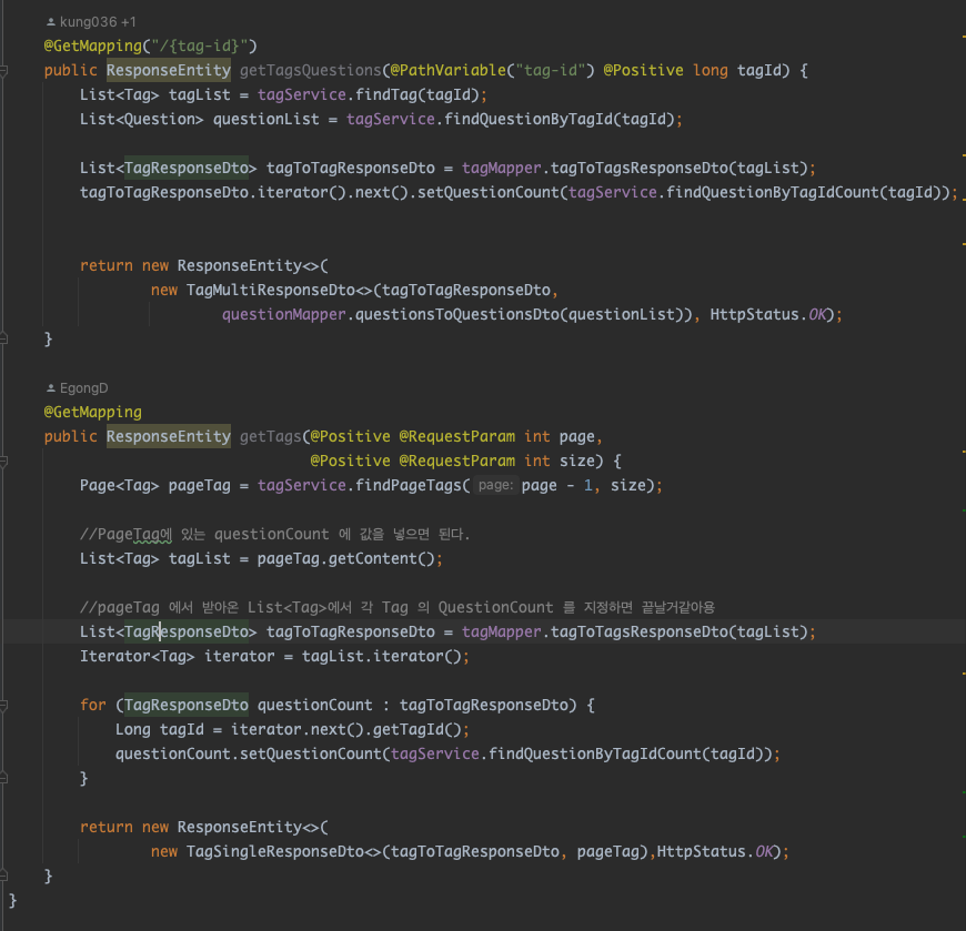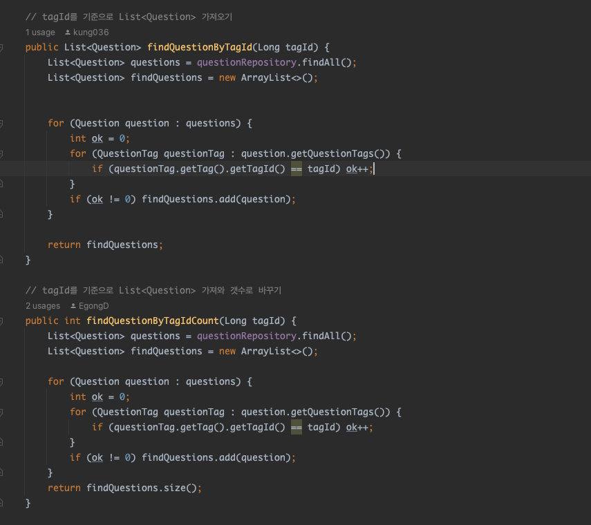 tagId를 기준으로 Question List를 가져오는 코드를 작성했고 두번째 코드에는 Question List를 가져와 갯수로 바꾸는 코드를 작성하였다.
