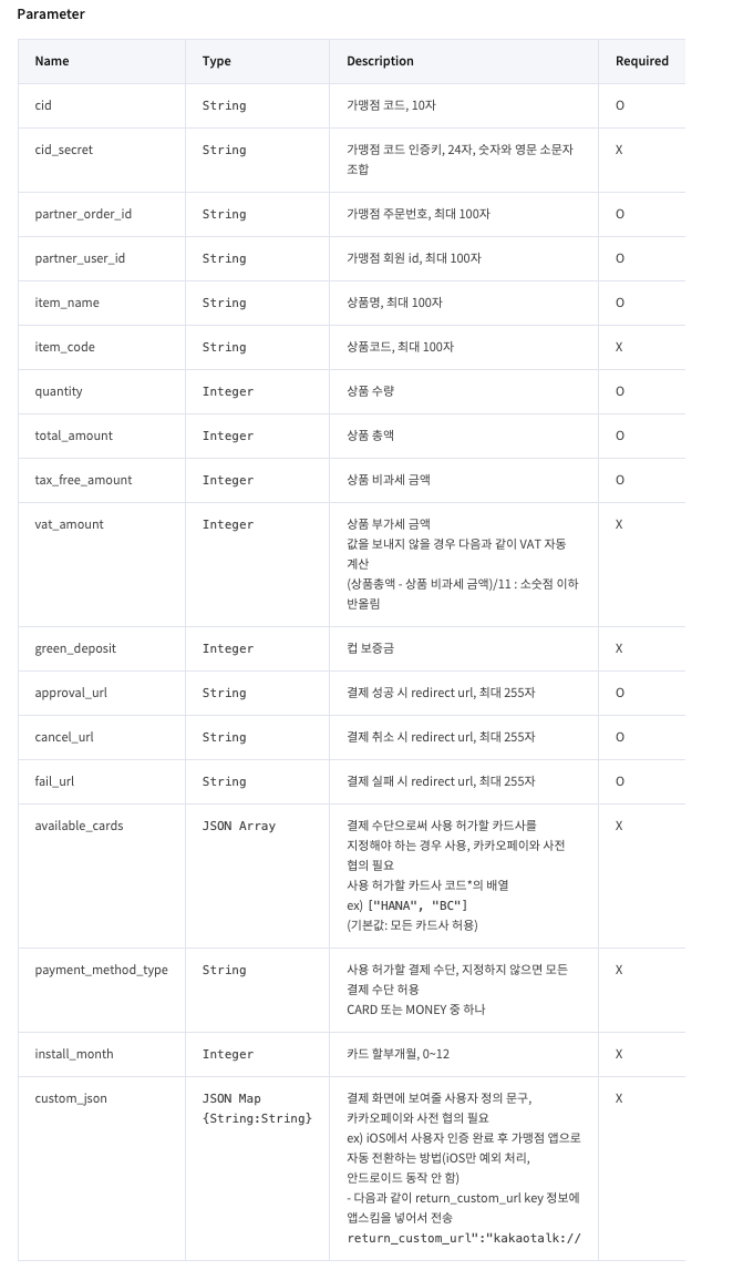- 결제 준비 Request 파라미터에 담을 값들(Required에 O 표시는 필수로 들어가야 한다.)