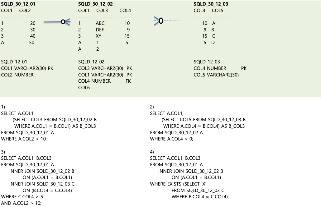 - FROM A테이블에서 INNER JOIN함으로써 같은것만 남긴다.(A.COL1 = B.COL1이니 다 남는다.) WHERE B.COL3 > 'X'; 는 문자열 연산이다. X문자열보다 큰것만 남긴다.(A~C, D~F는 X보다 작고, XY는 X가 동일하고 알파벳이 추가되어있으니 선택된다. )