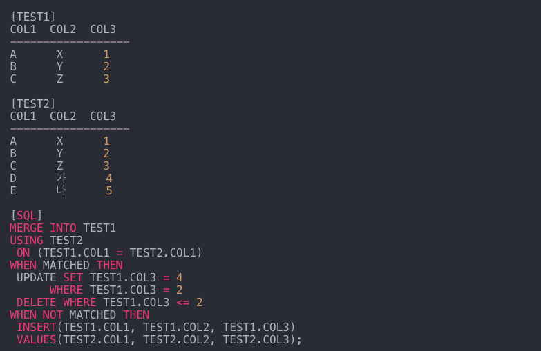 - MERGE INTO문은 특정 키에 대해서 레코드가 있을 때에 수정사항에 대해서 UPDATE를 하고, 레코드가 없으면 새롭게 INSERT를 할 수 있는 구문이다.(DELETE는 실행되지 않는다.)