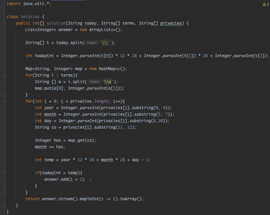 오늘 날짜를 의미하는 문자열 today, 약관의 유효기간을 담은 1차원 문자열 배열 terms와 수집된 개인정보의 정보를 담은 1차원 문자열 배열 privacies가 매개변수로 주어집니다. 이때 파기해야 할 개인정보의 번호를 오름차순으로 1차원 정수 배열에 담아 return 하도록 solution을 완성하는 문제